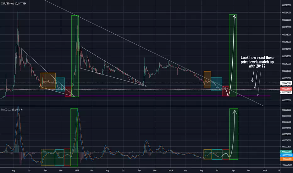 In my previous XRP post, I anticipated it would take until mid-August before we had the massive breakout that we are all waiting for. I think this MACD pattern supports that theory. Also, notice how all the areas identified hit the same price levels they did in 2017. If I'm right, XRP could lose quite a bit before liftoff, potentially more than half from its current level. If the price takes off from here, I'll buy the breakout. But my strategy will be to have my buy order around the .000015 level to try and make the most of this pump. If you see 100BTC buy wall down in that area, that's not me, but probably a couple whales with the same strategy I have ;) Cheers!