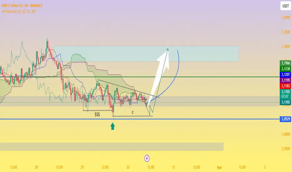 Il grafico mostra XRP scambiarsi tra una zona di supporto cruciale intorno a 3,05 $–3,09 $ e una resistenza superiore tra 3,19 $–3,23 $, configurando un possibile bandierina rialzista o wedge discendente sul time‑frame da 30 minuti: