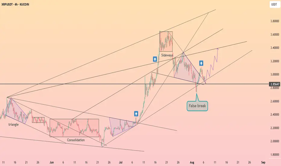 XRPUSDT faked a breakdown below 2.85 and is now recovering back into range. This aligns with previous bullish setups following consolidation. As long as the false break holds, price may attempt to move toward 3.40–3.50 again.