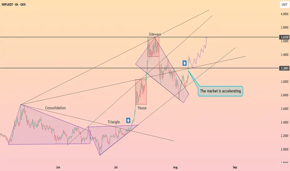 XRPUSDT snapped back above 3.20 after a corrective slide from the 3.65–3.70 supply band. Structure shows a strong leg up out of a large triangle base, a brief “pause,” then a channel‑style pullback that just broke to the upside. As long as the market holds 3.10–3.20, upside magnets are 3.35, 3.50 and the key cap at 3.66. A decisive close above 3.66 would validate a fresh trend leg; a loss of 3.10 would likely revisit 2.95–3.00 demand. Momentum favors continuation while higher lows stack above reclaimed trend support.