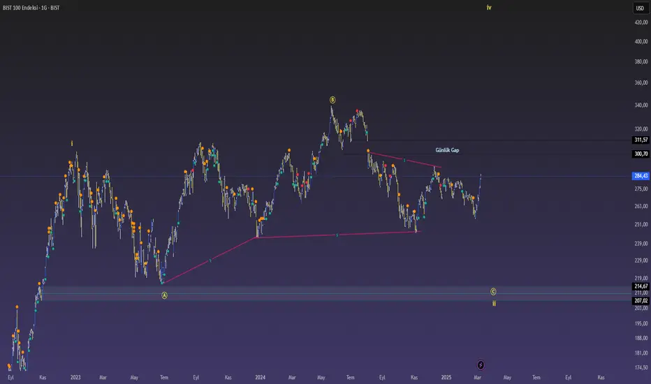 BİST100'de her ne kadar yön yukarı görünse de günlük gape denk gelen 300-310 dolar bandının hacimle kırılmaması durumunda yükselişin kalıcı olmayabileceği fikrini aklımızda bulundurmamız gerekmektedir. 1-3 aylık süre zarfında yükselişine devam etse de Mart kapıdan baktırıp kazma kürek yaktırabilir. Bu süre zarfında küçük zaman dilimlerinde long-spot yönlü işlem fırsatları kovalanabilir.