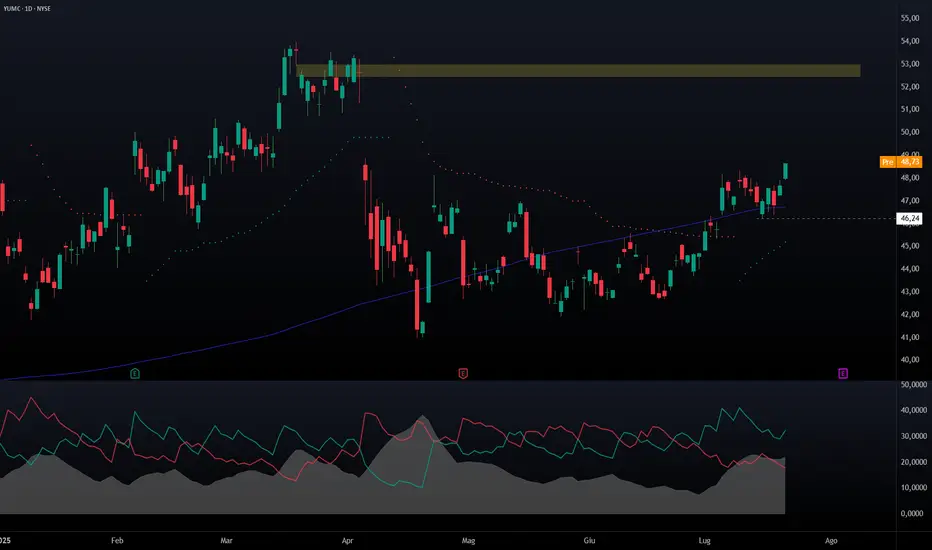 Impostazione tecnica interessante con target la chiusura del vecchio gap e resistenza in area 53 attenzione allo stop in basso. Impostazione DMI positiva crescente direzionalità buona nessun eccesso per il momento. Stop in area 46