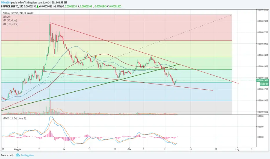 Grafico a 4h di Zil/Btc: il prezzo, dopo aver rotto a ribasso la pennant formatasi nei giorni scorsi, sembra aver rimbalzato su una trendline che collega gli ultimi minimi registrati. La configurazione pare essere a Falling Wedge (linee rosse) e al momento siamo diretti al lato superiore. Interessante posizionarsi Long, sarà necessaria la spinta dei volumi e degli indicatori. Zilliqa, nell'ultimo periodo, sembrava aver movimentato la cosiddetta FOMO e il progetto è particolarmente valido.