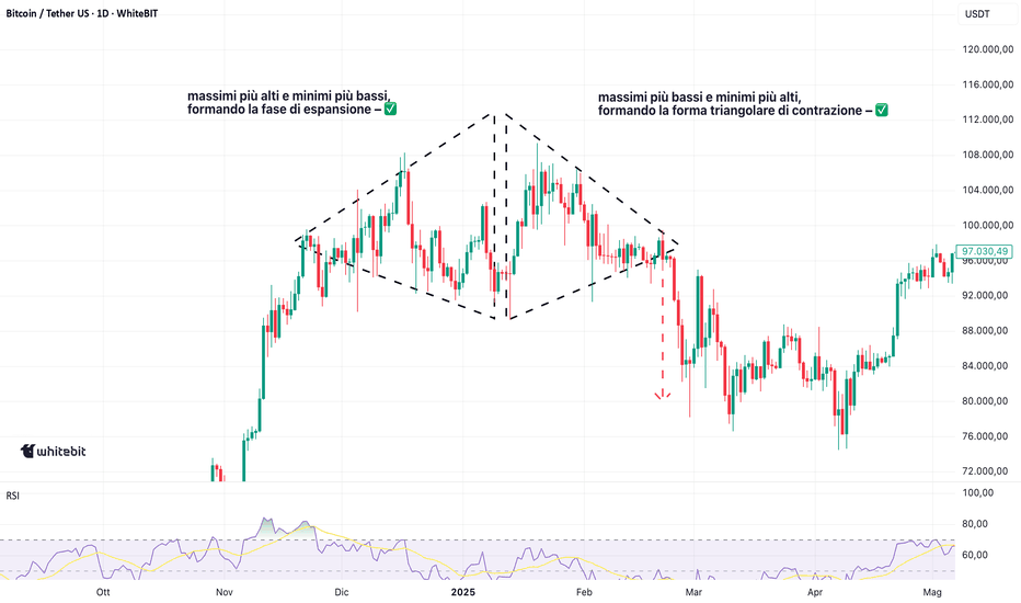 Tra la fine del 2024 e l'inizio del 2025, Bitcoin ha registrato un'impennata fino a 105.000 dollari. Dopo questo trend rialzista, il comportamento del prezzo ha iniziato a cambiare: le candele si sono prima allargate e poi ristrette, formando un diamond top sul grafico giornaliero.