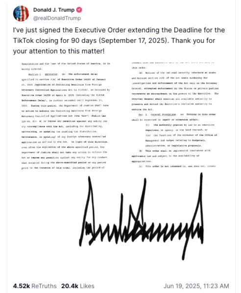 据在线报道,这一最新延期标志着第三次推迟,给予TikTok额外的90天时间寻找买家,否则将在美国被禁止。