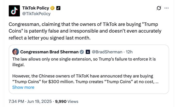 TikTok官方政策账户于周四在X平台上回应了加利福尼亚州民主党众议员Brad Sherman的指控,否认其所有者购买Official Trump(TRUMP)迷因币的说法。
