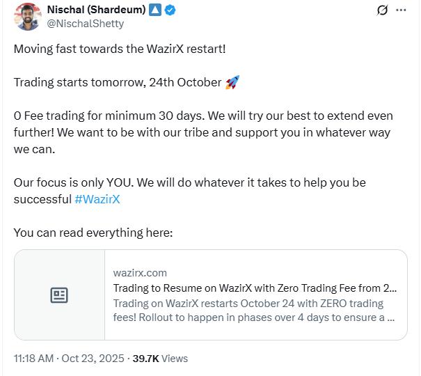 On Thursday, WazirX CEO Nischal Shetty announced that his platform would begin trading again on Oct. 24. The exchange will initially offer zero-fee trading for the first 30 days. It is also gradually introducing trading pairs with the rupee, starting with Tether’s USDt (USDT) stablecoin.