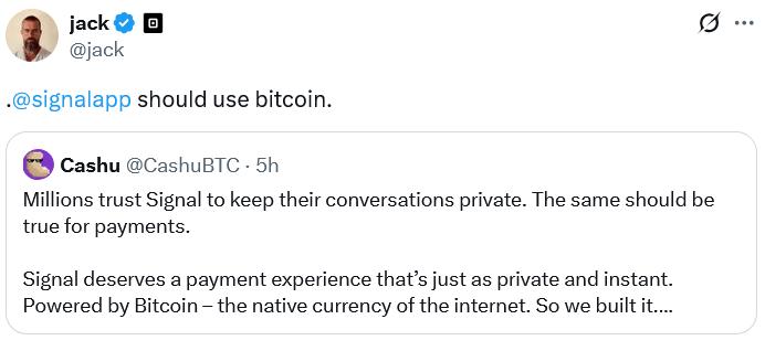 “@Signalapp should use Bitcoin,” Dorsey posted to X on Thursday, retweeting a post from pseudonymous Bitcoin developer Cashu, who is behind the Bitcoin for Signal campaign.