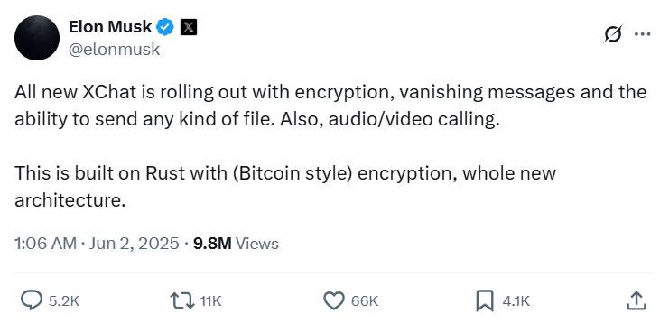 5月29日,X表示必须暂停其加密消息功能以进行改进,这可能与XChat的发布有关。