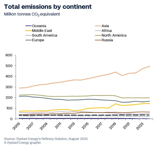 L’Asia, e successivamente il Medio Oriente, hanno registrato un aumento significativo delle emissioni totali delle raffinerie a causa della rapida crescita della capacità e della produttività, secondo Rystad Energy.
