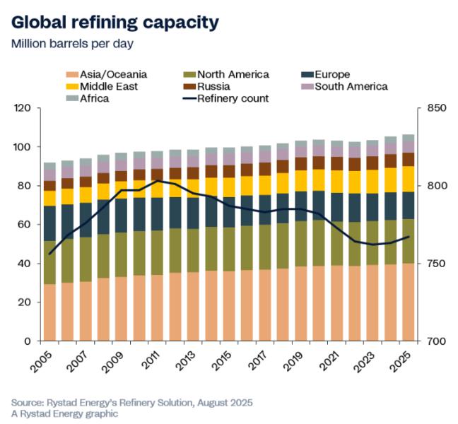 Nonostante la riduzione del numero di raffinerie, la capacità di raffinazione globale è aumentata per far fronte al crescente volume di petrolio che richiede la lavorazione, secondo l’ultima ricerca di Rystad Energy.