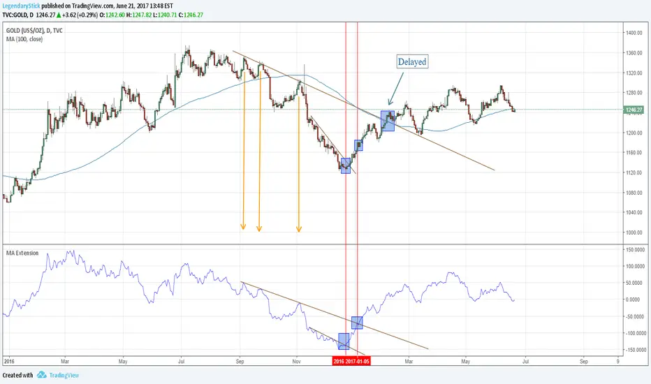 This indicator measures the vertical distance form the current close to the MA of your choice. I find that it does not work best as an oscillator, but it works well for providing early signals for taking profits when trend continuating. For example, if you go short due to a retracement to the MA (of your choice) take profits when a bearish trendline is broken (signalling the start of a bullish correction) that corresponds to the highs of the chart. The logic behind this indicator is that the breakouts of trendlines of an assets difference from an MA will precede corresponding breakouts of trendlines drawn on raw price. Kind of like Momentum, except it takes trend into account. Momentum has the same leading feature when it comes to drawing trendlines , but trendlines will be harder to draw due to the Momentum indicators oscillatory behavior.