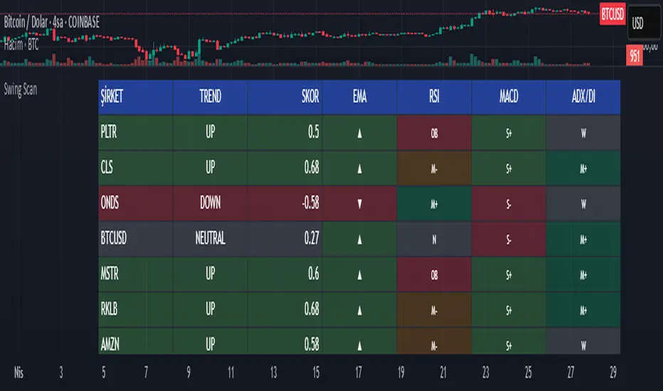 This TradingView indicator (written in Pine Script v6) is designed to help identify swing trading opportunities. It calculates an overall trend strength and direction score by combining multiple technical analyses for up to 20 financial assets (stocks, cryptocurrencies, forex, etc.) that you specify. It presents the results in a customizable table, allowing you to quickly scan the market.