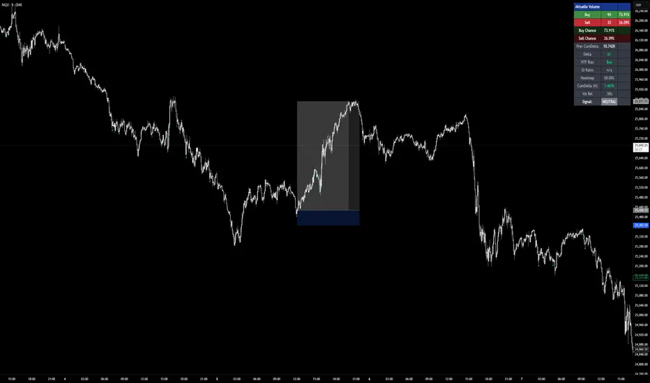 It tracks live Buy/Sell pressure, session-based CumDelta behaviour, higher-timeframe directional flow, relative volume, heatmap sentiment, and signal strength.
