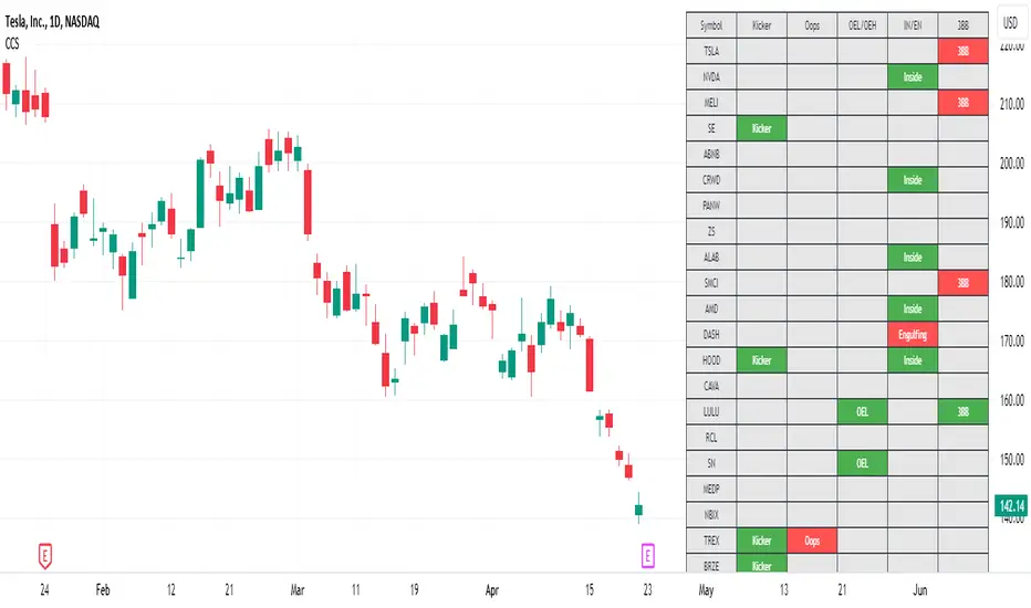 The Candle Combo Screener allows you to see candlestick combinations for up to 5 different tickers at the same time. If one of the candle combination is detected the corresponding cell will be highlighted to alert you.
