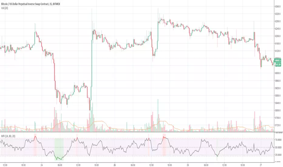 MFI with highlights when value is overbought/oversold and adjustable overbought/oversold thresholds. There is also an option to disregard candle wicks in the calculation in case that could be helpful.