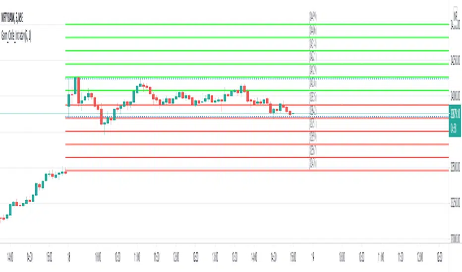 This indicator is designed to generate Gann Circle Intraday Levels based on HIGH and LOW of the opening bar for the day. You may use the bar interval (1 minute, 3 minutes, 5 minutes, 15 minutes etc.) which is suitable for the underlying instrument. Support and resistance lines for the day would be generated only after confirmation of the opening bar of the day.