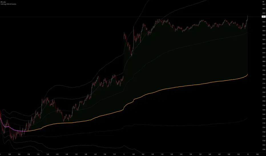 Implementing Pine's new Visible range function I have built with the help of rumpypumpydumpy a Visible range Vwap with Standard deviations in the same style and color way originally created by Zach Hurwitz, This is created in the styling and under the teaching of his education over the last few years. Zach uses intraday, and long term strategy based around 4 trade types that are taken in and around Vwap and its deviation bands. Whether that is intraday vwap , Longer term time based vwaps, Event based vwaps such as earnings , Gaps, Highest Volume based, and now "Visible range" based vwaps. The new visible range function is a huge help and time saver when wanting to quickly see a longer dated vwap or a vwap from a specific spot on your chart. All you have to do is scroll to that position on the chart and the Vwap and bands automatically launches from the furthest most left candle on your chart using the source input user chooses, HLC3, High, Low, etc.
