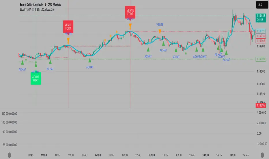 Filtering False Signals: By combining Stoch RSI crossovers with TEMA trend confirmation, most false breakouts during choppy price action are filtered out.