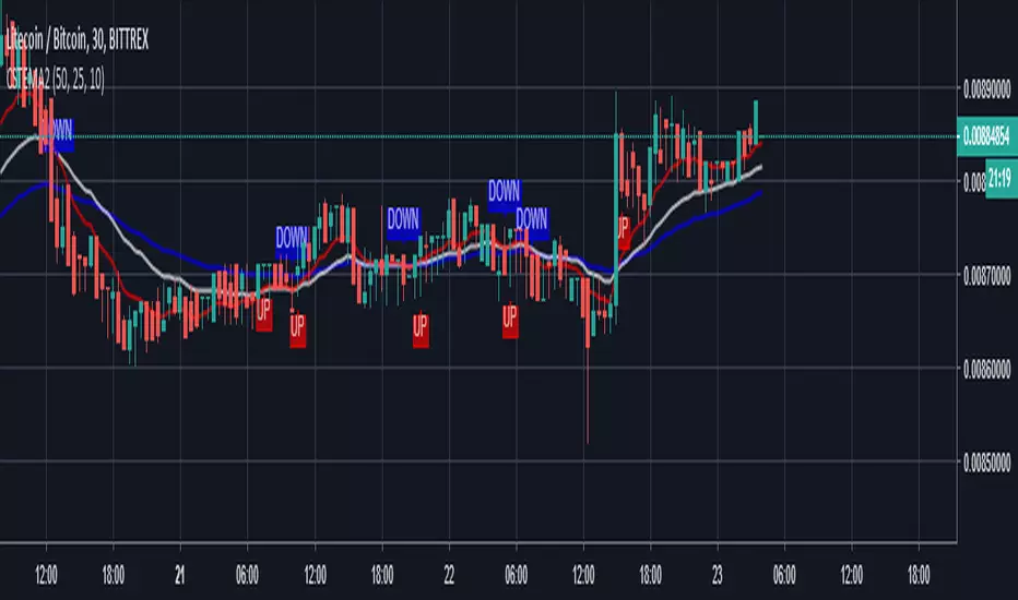 Crossing Strategy of Three Exponential Moving Averages with an up and down indicator.