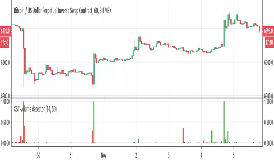 This is XBT volume detector . it working on bitmex for XBT detection of volume changes, I suggest to play between 30 min to 1 hour graph candle