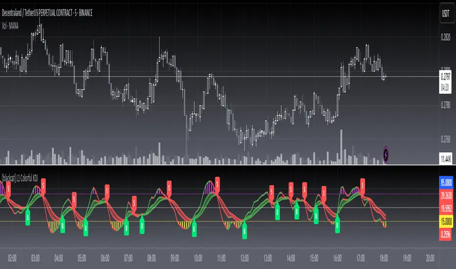 OVERVIEW The [blackcat] L1 Colorful KDJ indicator provides a dynamic visualization of the KDJ oscillator enhanced with adaptive moving average calculations. It features colored trend indication for K/D/J lines, visual alerts via candle markers, and customizable parameter settings.