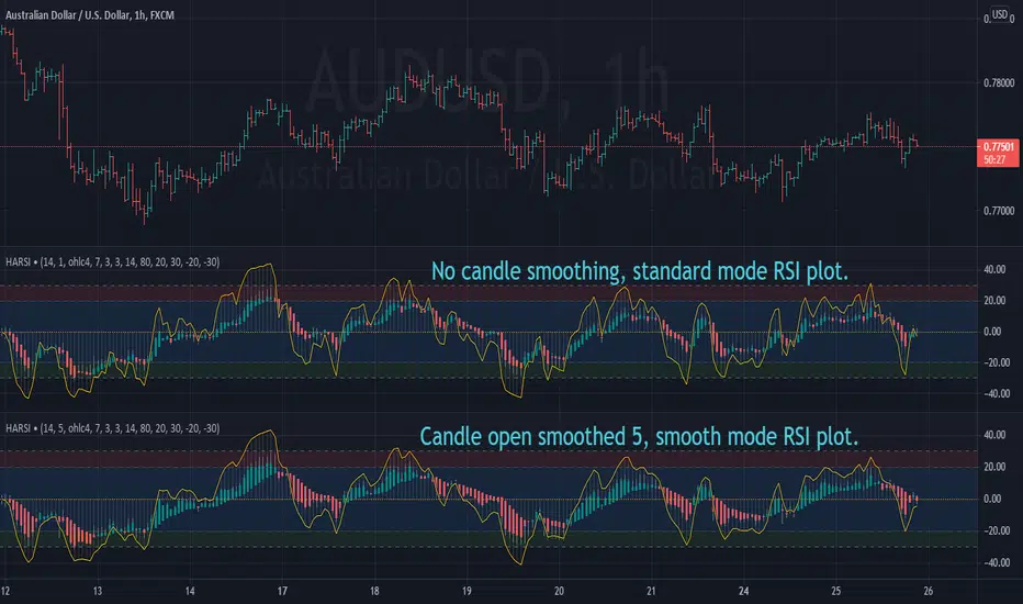 - Added option to apply smoothing to the Open of the HARSI candles, this is simply an extension to the base Heikin Ashi Open calculation to help better visualise trend strength if desired. This setting defaults to 1 (no smoothing) see below for comparative image.