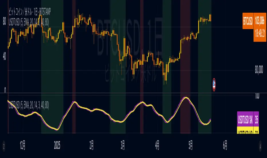 The USDTUSD Stochastic RSI [SAKANE] indicator visualizes shifts in market sentiment and liquidity by applying the Stochastic RSI to the USDT/USD price pair.