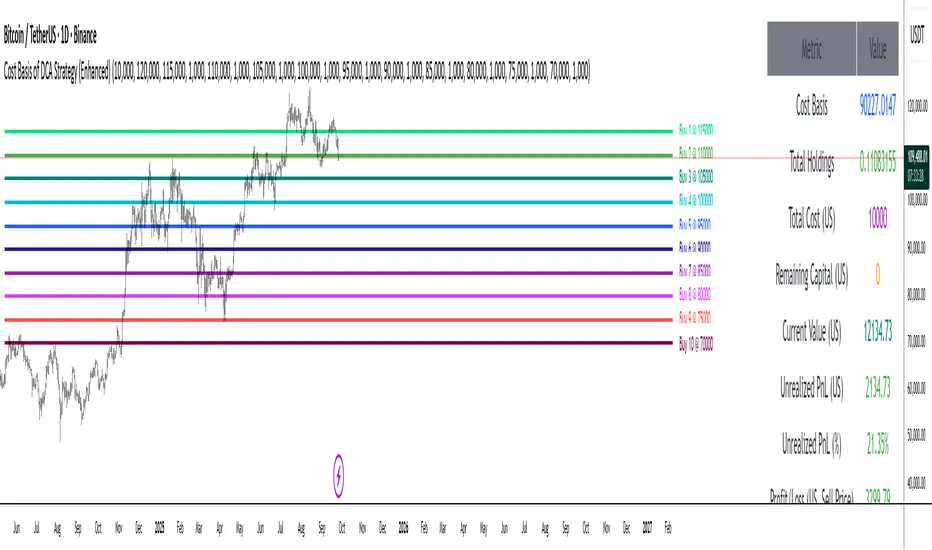 In essence, this indicator reframes the practice of DCA into a structured analytical exercise. It empowers investors to understand the true average entry cost, evaluate ongoing performance, and simulate future outcomes under different price scenarios. By doing so, it elevates DCA from a passive habit into an active, data-driven investment methodology, allowing users to make more informed, confident, and strategically grounded decisions.