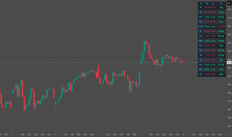 This script provides a multi-ticker table for TradingView charts. It is fully open-source and free to use. The table displays up to 15 tickers, including SPY as the baseline symbol. The script updates in real-time on any timeframe.