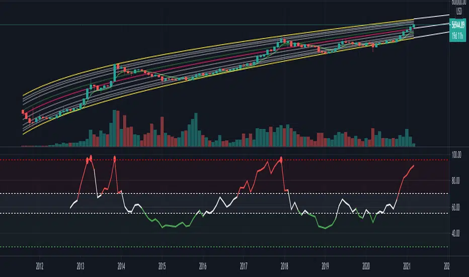 The RSI Market Ranges helps to indicate if Bitcoin is overbought, oversold or neutral according to historical price and RSI high and low correlations, it is simply a color coded RSI indicator.