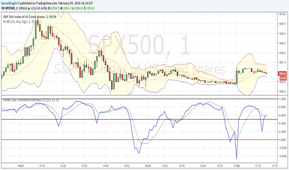 The Power Law Correlation Indicator is an attempt to chart when a stock/currency/futures contract goes parabolic forming a upward or downward curve that accelerates according to power laws.
