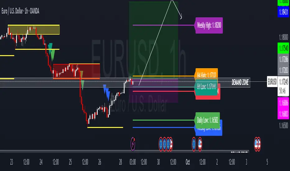 📄 DescriptionThis indicator overlays Highs and Lows from the previous Weekly, Daily, and H4 candles directly onto your chart, providing clear visual references for institutional support and resistance zones. It includes high probability breakout signals that trigger only during selected active trading sessions, helping traders align entries with market timing and volume.