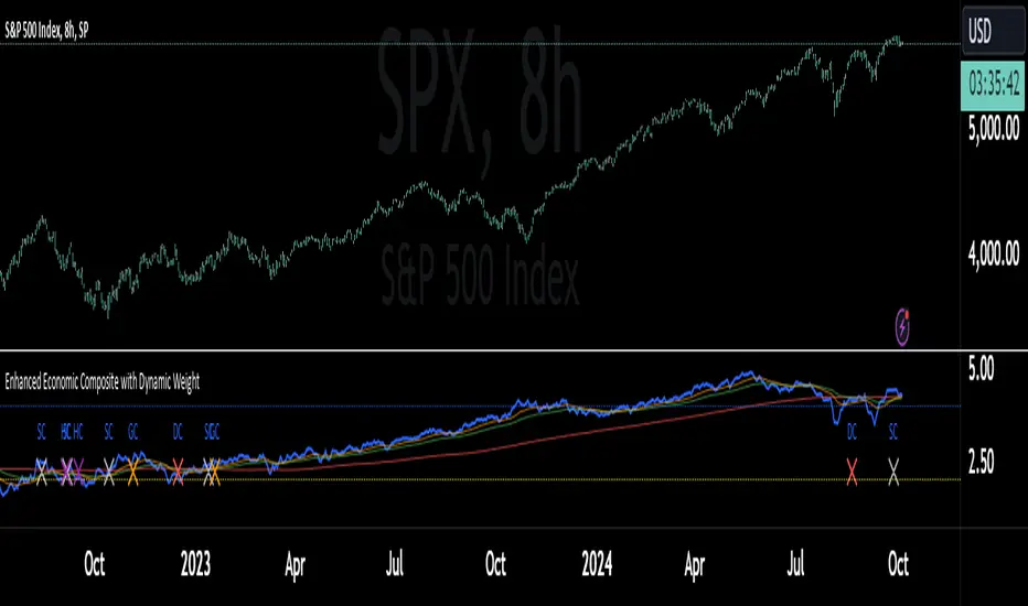 The "Enhanced Economic Composite with Dynamic Weight" is a comprehensive tool that combines multiple economic indicators, technical signals, and dynamic weighting to provide insights into market and economic health. It adjusts based on current volatility and recession risk, offering a detailed view of market conditions.