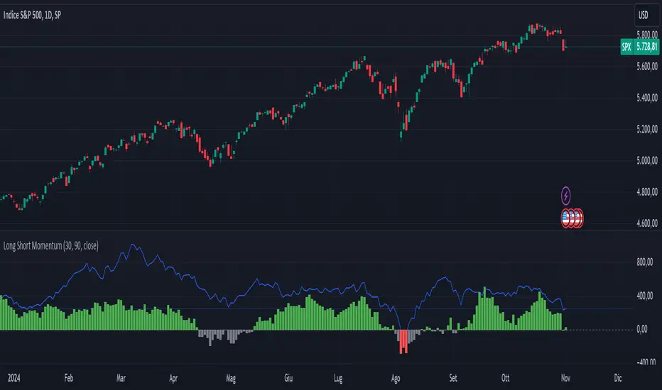 This indicator is designed to visualize short-term and long-term momentum trends.The indicator calculates two momentum lines based on customizable lengths: a short momentum (Short Momentum) over a smaller period and a long momentum (Long Momentum) over a longer period. These lines are plotted relative to the chosen price source, typically the closing price.
