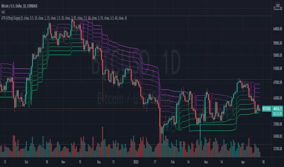 This script allows Volatility Stop, an average true range-based indicator, to be plotted like a "Guppy" multiple moving average indicator. Backtesting results seem pretty good when a solid majority of the lines are in agreement.