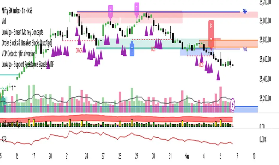 Detects Volatility Contraction Patterns (VCP) using SMA, BB, and Volume logic