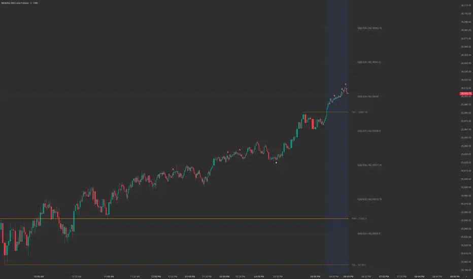This enhanced version of the QQQ overlay script builds on the original by © PtGambler, adding smoothing via stepped ratios updated on candle close to eliminate oscillation, optimizing performance by reusing lines/labels, restricting visibility to relevant symbols (NDX, NQ1!, NAS100USD), and improving visuals with rounded levels, adjustable level counts (default 5 total), extended lines, and label styles matching "Key Levels" indicator for better readability (gray text, transparent background). Removed unnecessary table and floating labels for a cleaner chart. Thanks to © PtGambler for the foundational work!