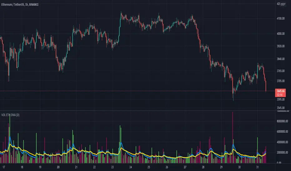 This indicator takes the volume from the biggest exchanges and plots the average volume. Exchanges incorporated in this average include Bitfinex, Coinbase, Bitstamp, Bitmex, Kraken, Binance, Bithumb, Flyer, OkEx, and CEX. The chart also has two Exponential Moving Averages (9-candle EMA & 21-candle EMA) added onto the volume pane to better understand relative volume. Thank you Julio and Mitch for this indicator