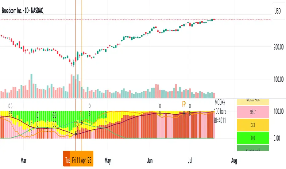 MCDX Plus is an indicator to show the relative level of Profitable Chips, Floating Chips and Locked Chips for Stocks market.