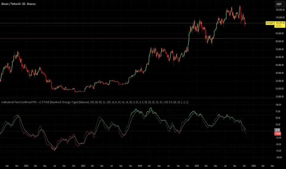 The Institutional Trend Confirmed PRO – v2.3 TUNE (Reactive & Strong) is an advanced institutional-grade indicator designed to confirm true trend direction and reversals with precision.