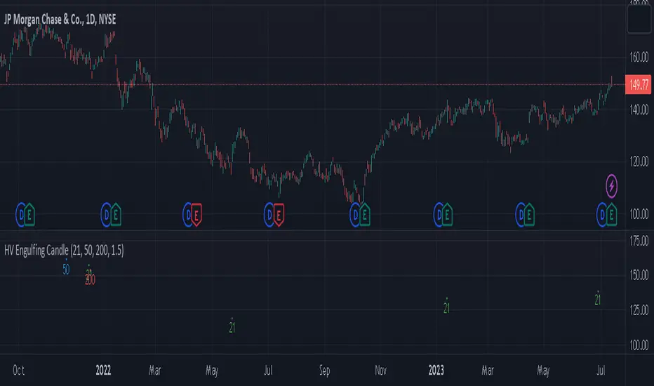 The indicator is designed to identify and signal instances of high volume and engulfing candles near three Exponential Moving Averages (EMAs): the 21EMA, 50EMA, and 200EMA. It can be used in various financial markets such as stocks, forex, commodities, or cryptocurrencies, as long as the market data is available on the TradingView platform.