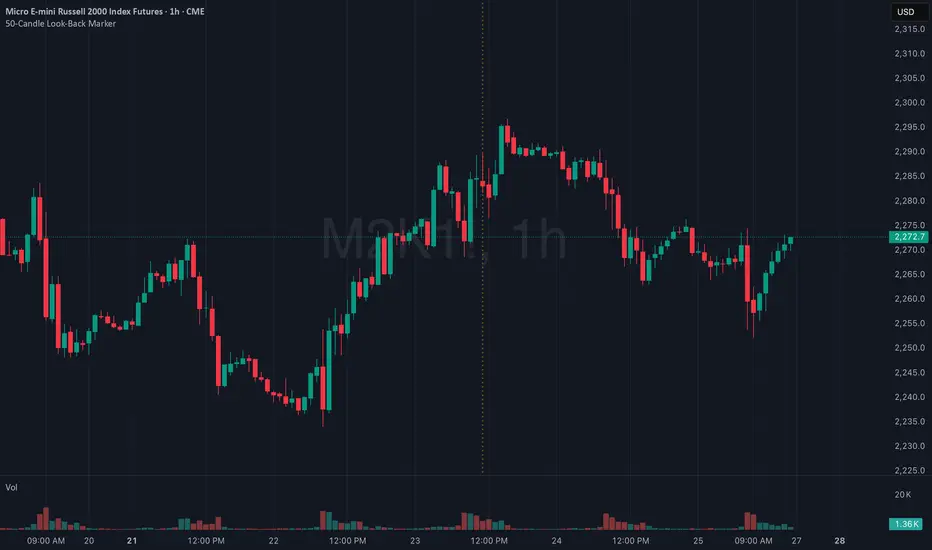 It simply redraws one vertical dotted line that always sits exactly 50 bars behind the current bar, so you can check at a glance that any trend-line you draw has at least 50 candles of data to the right of it.