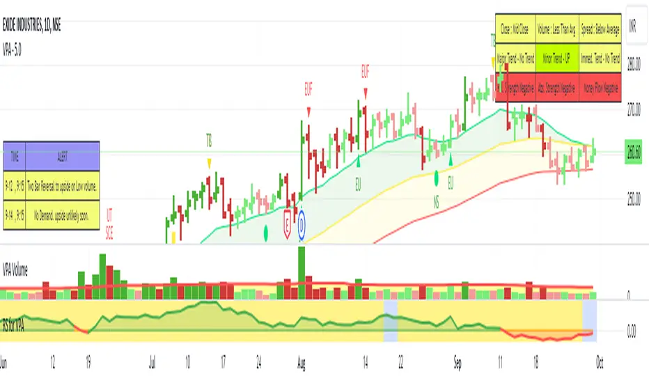 This is a upgraded version of the vpa analysis script which basically implements Volume Spread Analysis (aka Volume Price analysis). It has been rechristened as VPA 5.0 to be inline with version released for Amiboker package so that all future upgrades will go hand in hand. All most all featured of the Amibroker version has been incorporated in this version. Some important additions are as follows