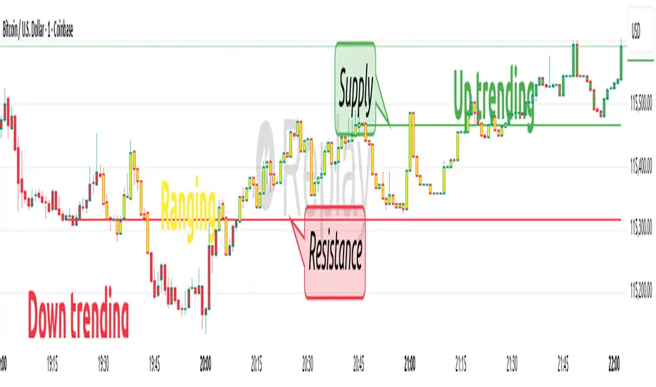This is a real-time range detection indicator. Based on previous supply and demand levels, it classifies each new bar as Up, Down, or Range.