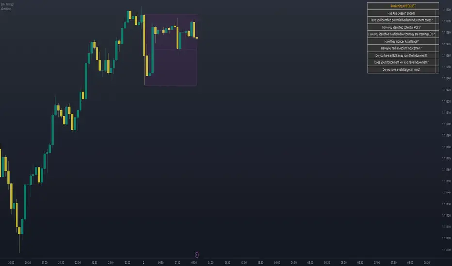 The Awakening Checklist indicator is a tool designed to help traders evaluate certain key market conditions and elements before making trading decisions. It consists of a series of questions that the trader must answer using the options "Yes", "No" or "N/A" (not applicable).