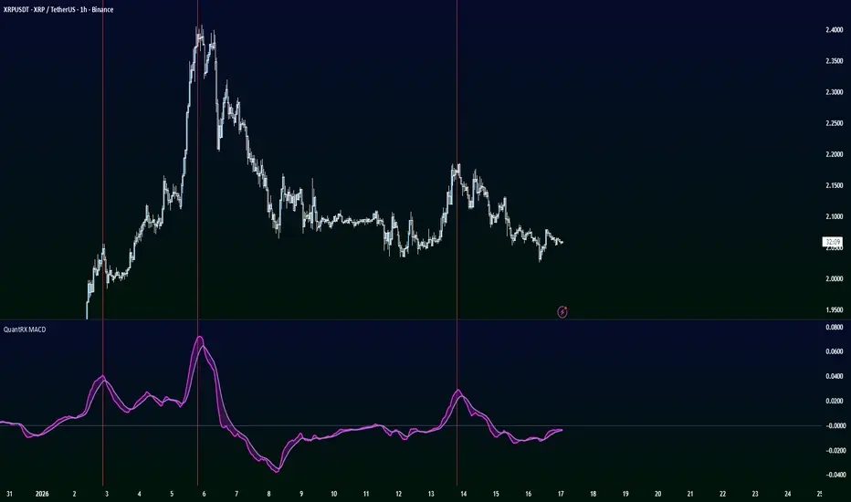 QuantRX MACD Lite is a minimal MACD visualization: MACD line, signal line, and histogram with an optional higher-timeframe (MTF) source.