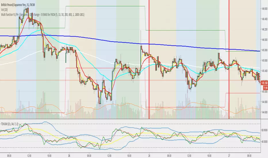 This is a multi script: it shows the day session from midnight to midnight, asia - europe- america sessions , Yesterday Hi & yesterday Low and 5 EMAS at 5,13,50,200,800