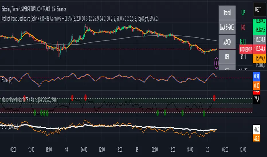 Royal Trend Dashboard combines EMA8–EMA200, SuperTrend, MACD, RSI, and ATR in one panel to automatically spot trend direction, pullbacks, and breakout entries while showing live risk-reward. It marks EMA8 touches and next-bar confirmations, triggers an ENTRY alert on the latest pivot break, calculates SL via SuperTrend±ATR or ATR×multiplier, and sets TP1/TP2 by R multiples. While in a trade it tracks live R:R and, when TP1 hits, prompts SL = BE to lock profits. Markers are pinned to price and the dashboard docks to any corner; on lower timeframes (e.g., 15m) you can align with a 1H higher-timeframe filter. In short: the Trend → Pullback → Breakout playbook with disciplined risk management and ready-made alerts—fast and practical.
