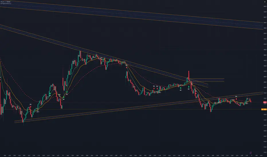 The indicator combines EMA trend structure with a smoothed RSI filter to identify high-probability long and short setups: